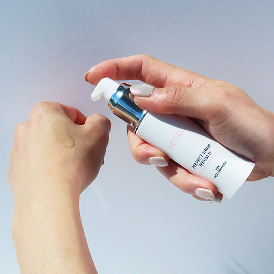 上腕の内側を⽯けんでよく洗い、やさしくふきとります。 洗った部分にvecel美容液を少量(約1cm円形)塗ります。